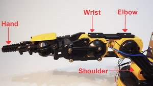 There are a number of robot arms available. We were able to find a used OWI-535 robot arm [1], but new ones can be purchased for between $30 and $60. For this project we wanted the robot arm to be mobile so we used duct tape to mount it on top of an Arduino car chassis [2].